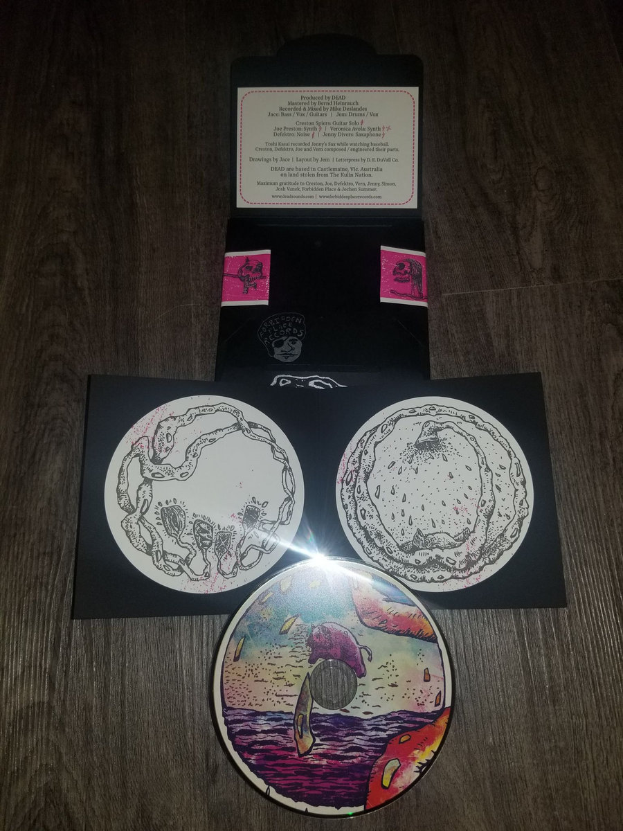 CD edition of DEAD - "Raving Drooling" in a hand printed fold over sleeve with decals and pro pressed CD's. An absolutely beautiful design. Very limited!